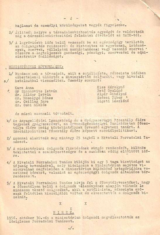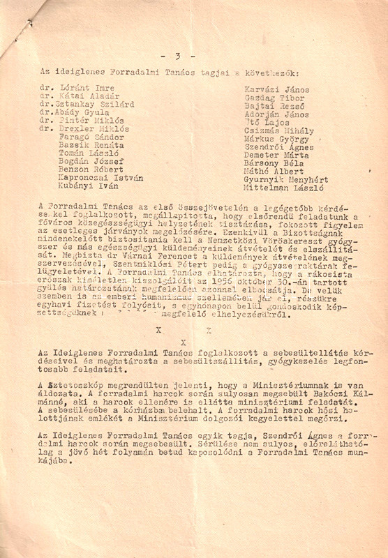 Belső terjesztésű orvosi folyóiratunk forradalmi lapszáma 1956. október 30-a körül készülhetett. A Nagy Imre-kormány és a forradalom mellett kiálló folyóiratszám közreadja az Egészségügyi Minisztérium Ifjúsági Szervezetének nyolcpontos kiáltványát. Lapszámunk tudatja, hogy a minisztérium számos vezető pozícióját mindenféle szakértelem nélkül töltötték be a párt lojális emberei, dokumentumunk név szerint felsorolja az alkalmatlan, azonnal elmozdítandó dolgozókat, részükre végkielégítést ígér, helyükre szakemberek kinevezését javasolja. Minisztériumi szinten a bérezés és munkaszervezés alapos áttervezését, valamint valódi dolgozói érdekképviselet felállítását javasolja, a gyógyszerellátás zavartalansága érdekében pedig azonnali lépéseket sürget. Belső terjesztésű hírlevelünk hírt ad a minisztérium Forradalmi Bizottságának október 30-i alakuló üléséről, a forradalom győzelmének tudatában pedig felsorolja megválasztott tisztségviselőit.