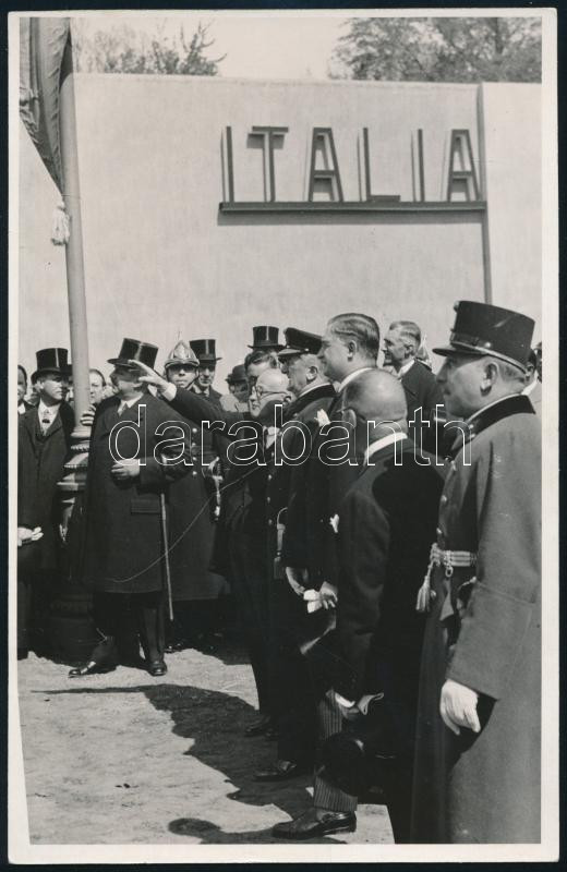 A millenniumi kiállítás után időszerűvé vált, hogy Budapesten évente megrendezzék a hazai agrár- és ipari vállalkozásokat bemutató vásárt. A törekvések 1921-től értek be. A Horthy Miklós kormányzó jelenlétében megnyitott (ekkor még mezőgazdasági jellegű) vásár természetesen propagandacélokat is szolgált, a háborús veszteségből felálló ország gazdasági erejét volt hivatott hirdetni, ennek szellemében évente megrendezték a városligeti eseményt, egyre bővülő tematikával. Az 1930-as években már nemzetközi szinten jegyzett Budapesti Nemzetközi Vásár elnökévé Chorin Ferenc (1879-1964) titkos tanácsost választották, felvételünkön ő magyaráz a Horthy Miklós államfő vezette politikai testületnek. Felvételünk feltételezhetően 1940. április 26-án, pénteken, a vásár nyitónapján készült, Olaszország pavilonjánál. A kormányzó másik oldalán Bornemisza Géza volt iparügyi miniszter áll (1935-1939), a háttérben további politikusok, fejükön a legformálisabb viseletnek számító cilinderrel, a rendőrség díszszázadának tagja acél sisakban vigyázza a rendet. Fényképünk készülési idejét a jelenlevők listája, az olasz pavilon oldalán használt betűtípus és a kormányzó évről évre változó ruházata alapján azonosítottuk.