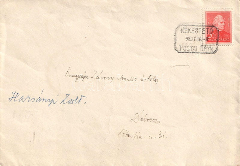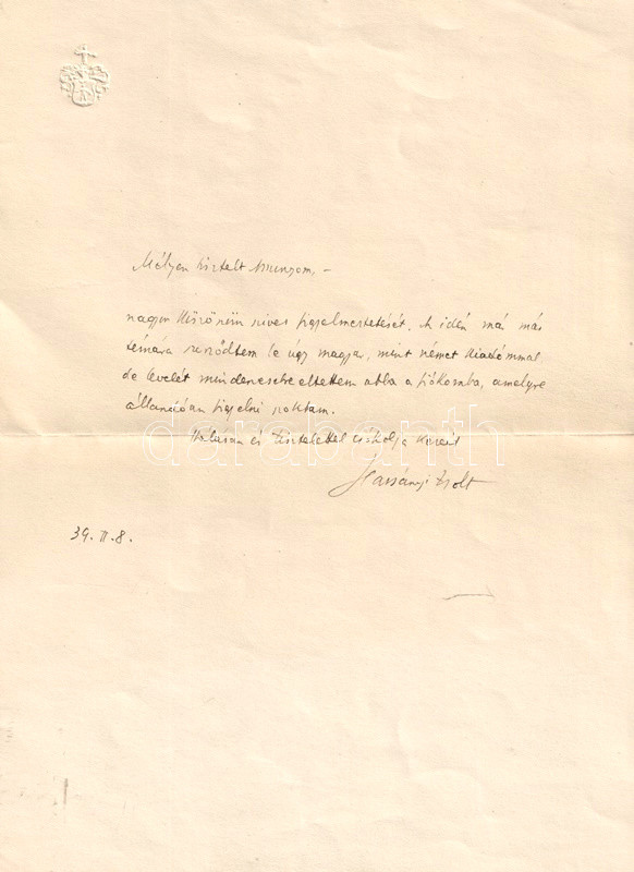 Szövege: "Mélyen tisztelt Asszonyom, nagyon köszönöm szíves figyelmeztetését. Az idén már más témára szerződtem le úgy magyar, mint német kiadómmal, de levelét mindenesetre eltettem abba a fiókomba, amelyre állandóan figyelni szoktam. Hálásan és tisztelettel csókolja kezeit: Harsányi Zsolt. 39. II. 8."