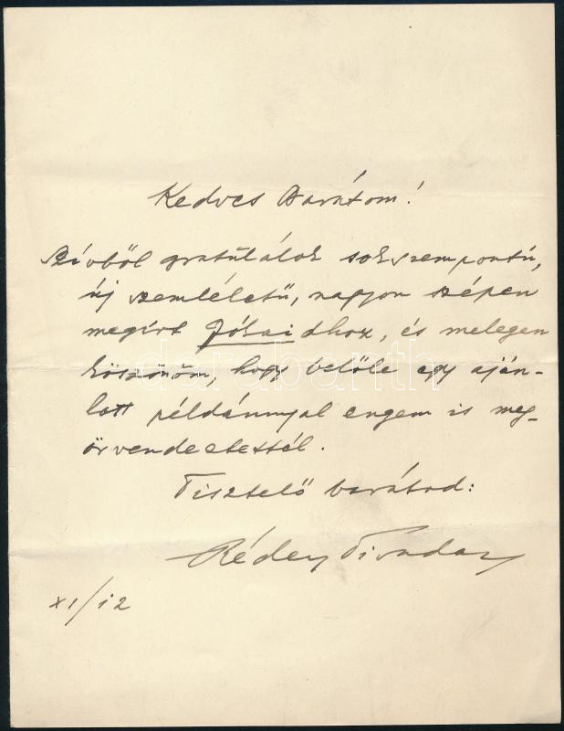 Description: Rédey Tivadar (1885-1953) könyvtáros, színház- és irodalomtörténész, az Országos Széchényi Könyvtár főigazgató-helyettesének saját kezű levele ismeretlen címzettnek, "Kedves Barátom!" megszólítással, melyben könyvéhez gratulál