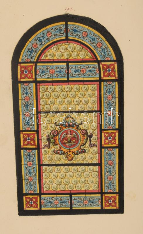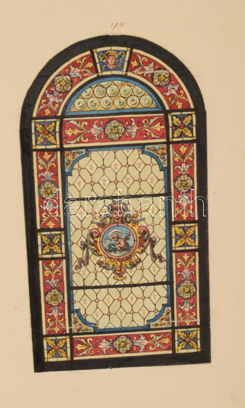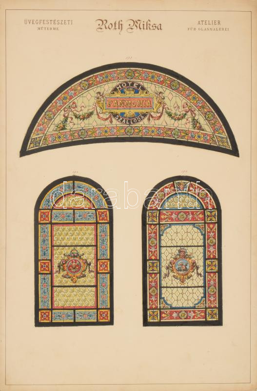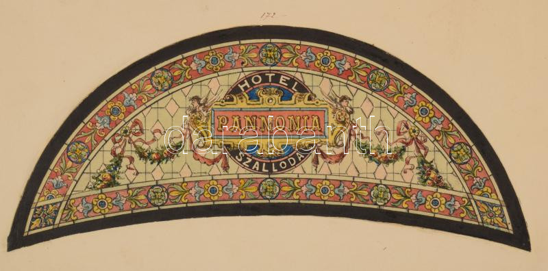 Róth Miksa (1865-1944): Hotel Pannónia szálloda üvegablak tervek ca 1885 (Bp., Rákóczi út 5-7). Akvarell, tus, karton, jelezve 33x49 cm