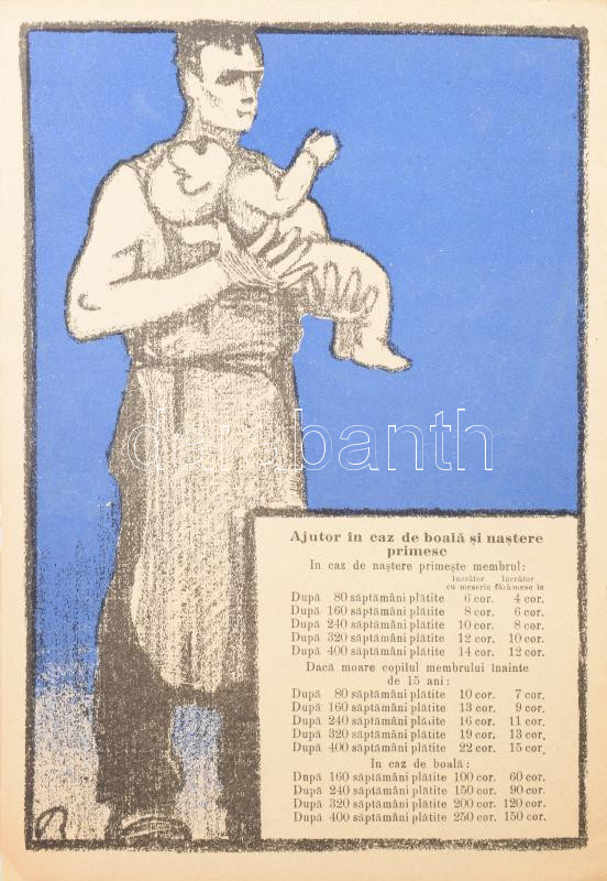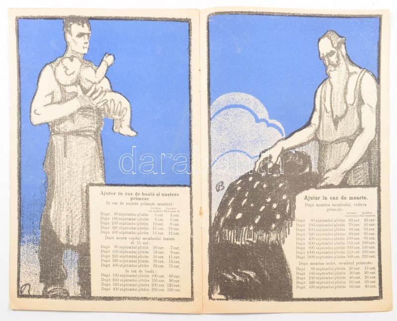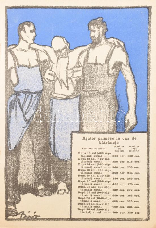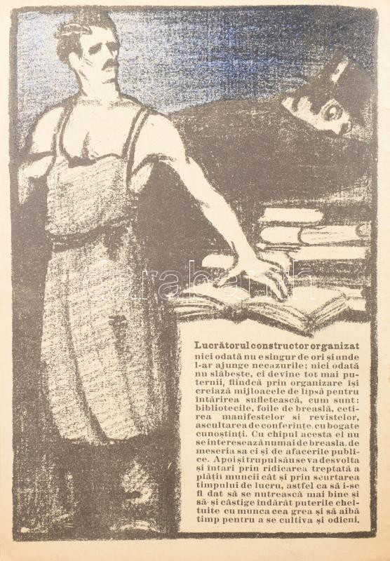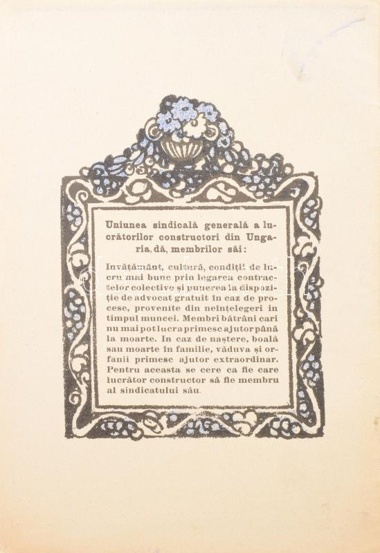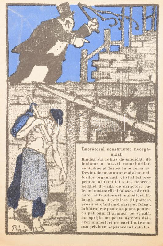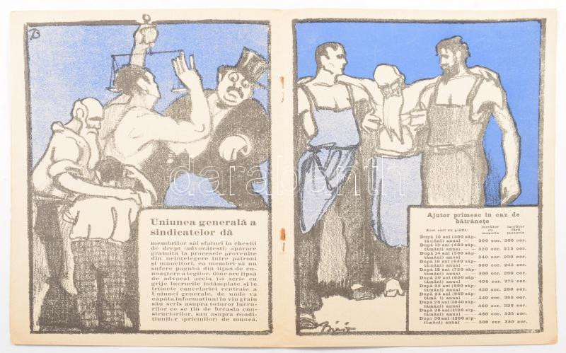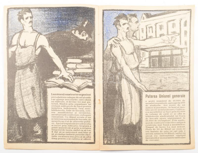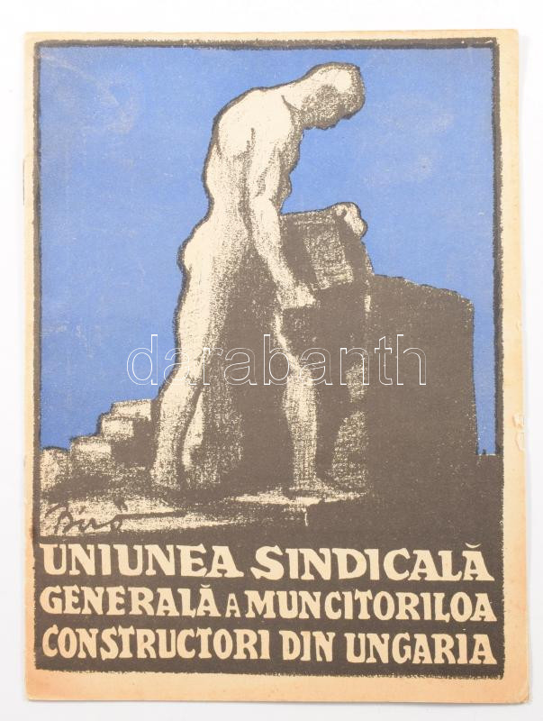 ca 1918 Bíró Mihály: [Magyarországi Építőmunkások Szakszervezetének grafikus, illusztrált kiadványa.] Uniunea Sindicală Generală a Muncitoriloa Constructori din Ungaria. (Budapest): Világosság-Nyomda Rt. (ca. 1918-19). Magyarországi Szociáldemokrata Párt. 12p. Ebből 11 oldalon Bíró Mihály (1886-1948) jelzett litográfiái, az őszirózsás forradalom és a tanácsköztársaság emblematikus plakátjait tervező grafikus munkáséletet és küldelemket bemutató darabjai. 24x18 cm Román nyelvű kísérő szöveggel, a Budapesten román származású munkásság megnyerésére. Rendkívül ritka, aukción eddig még nem szerepelt, szakirodalomban nem ismert kiadvány.