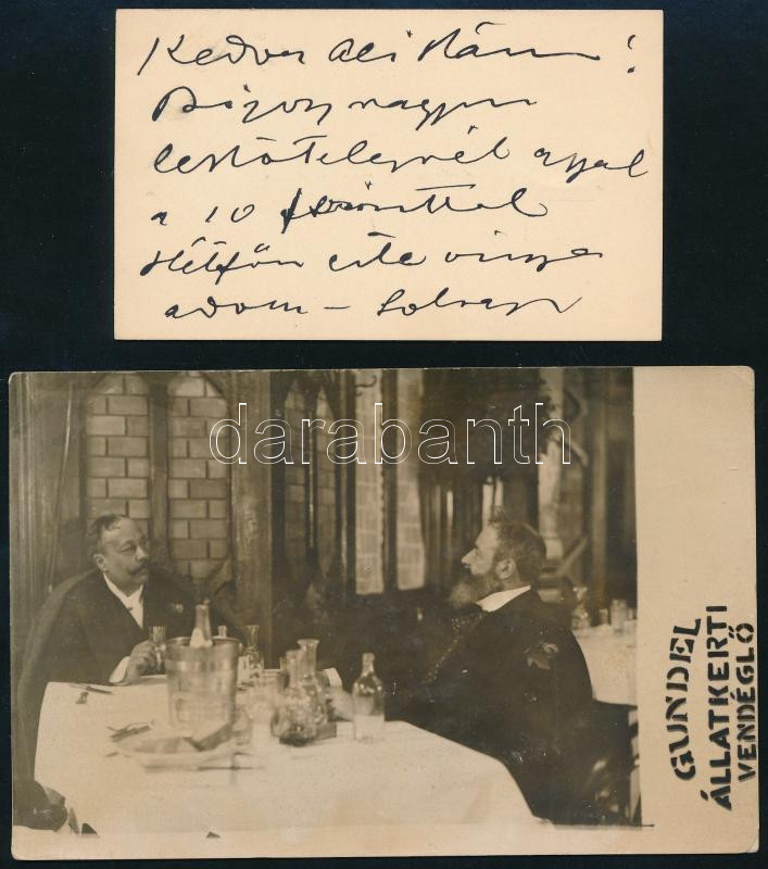 Description: cca 1910 Feszty Árpád (1856-1914) festőművész saját kezű sorai és aláírása névjegykártyáján + Feszty Árpád és Ihász Aladár (1886-1960) színész, rendező, drámaíró a Gundel állatkerti vendéglőben, fotólap, 9x14 cm