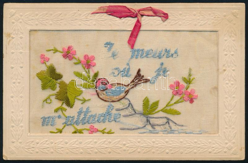 cca 1920 Hímzett üdvözlő kártya, 9×14 cm