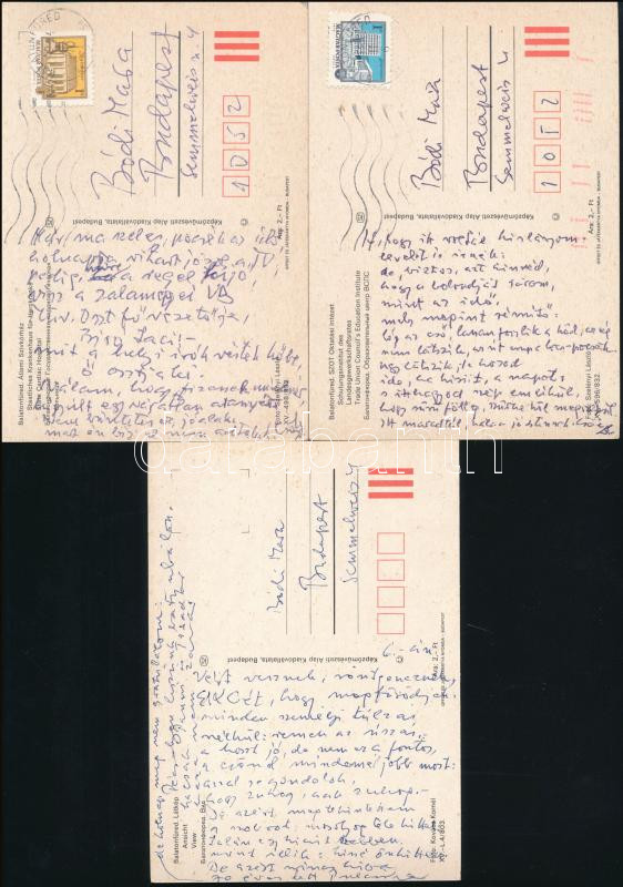 cca 1981-84 Keresztury Dezső (1904-1996) költő, korábbi korábbi vallás- és közoktatásügyi miniszter autográf, szellemes verses sorai Bódi Marának, össz .3 db balatonfüredi képeslapon, közte 2 db Keresztury Dezső autográf aláírásával.