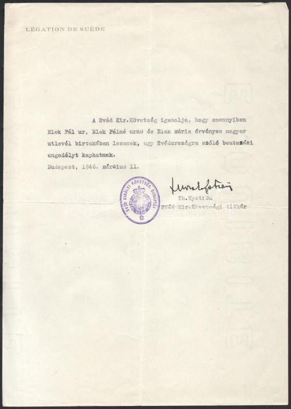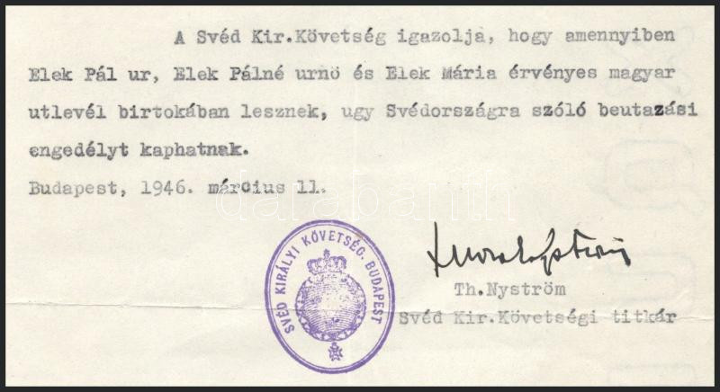 1946? A budapesti Svéd Kir. Követség igazolása magyar zsidó házaspár részére svédországi beutazáshoz Sigvard Nyström követségi titkár aláírásával
