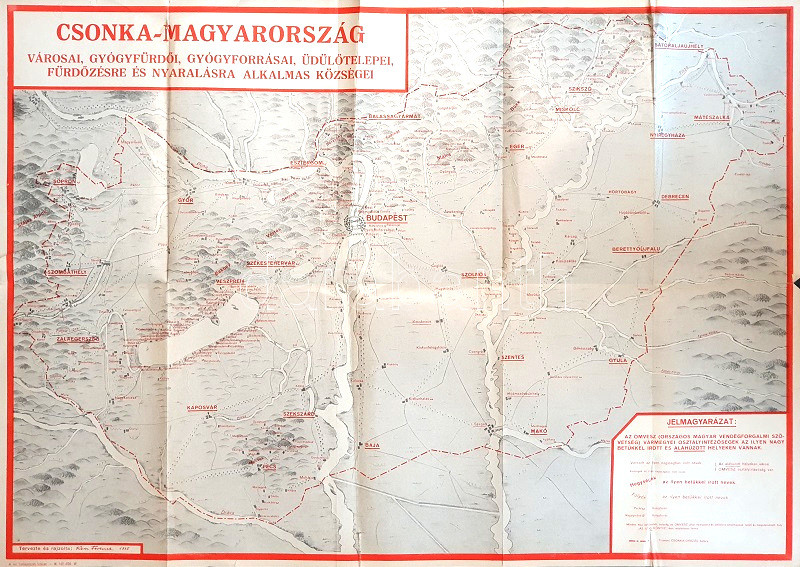 [Térkép] Csonka-Magyarország városai, gyógyfürdői, gyógyforrásai, üdülőtelepei, fürdőzésre és nyaralásra alkalmas községei. Tervezte Kern Ferenc. (1938).
