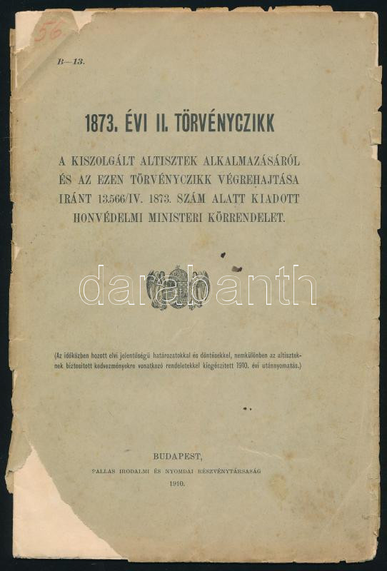 1910 1873. évi II. törvénycikk a kiszolgált altisztek alkalmazásáról é... https://www.darabanth.com/en/514-Auction-philately-postcards-numismatics-artwork-books-colletibles-jewelry/515.0/Art-and-other-collectibles/Military~78/1910-1873-evi-II-torvenycikk-a-kiszolgalt-altisztek-alkalmazasarol-es-az-ezen-torvenycik~II3464817