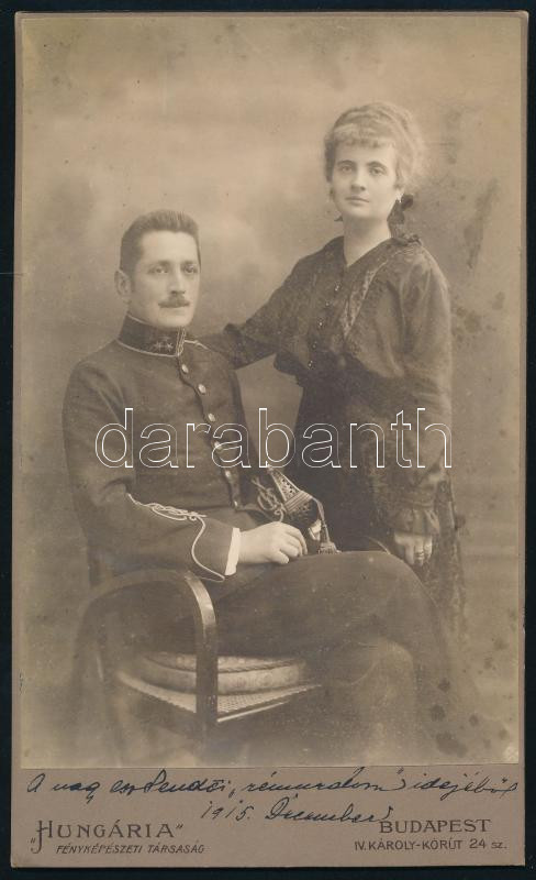 1915 Katonatiszt (Koós Dezső) felesége társaságában, kabinetfotó a ,,Hungária" fényképészeti társaság budapesti műterméből, feliratozva, 21,5x13 cm