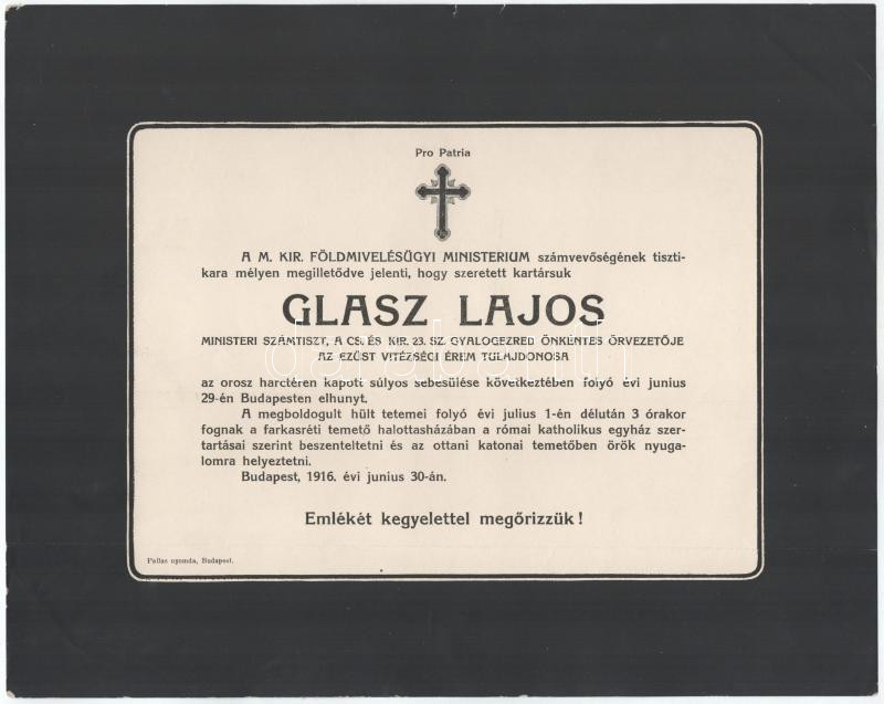 Description: 1916 Bp., Glasz Lajos, a cs. és kir. 23. gyalogezred önkéntes őrvezetője, az Ezüst Vitézségi Érem tulajdonosa halotti értesítője (az orosz harctéren kapott sebesülés következtében hunyt el), 23x29 cm