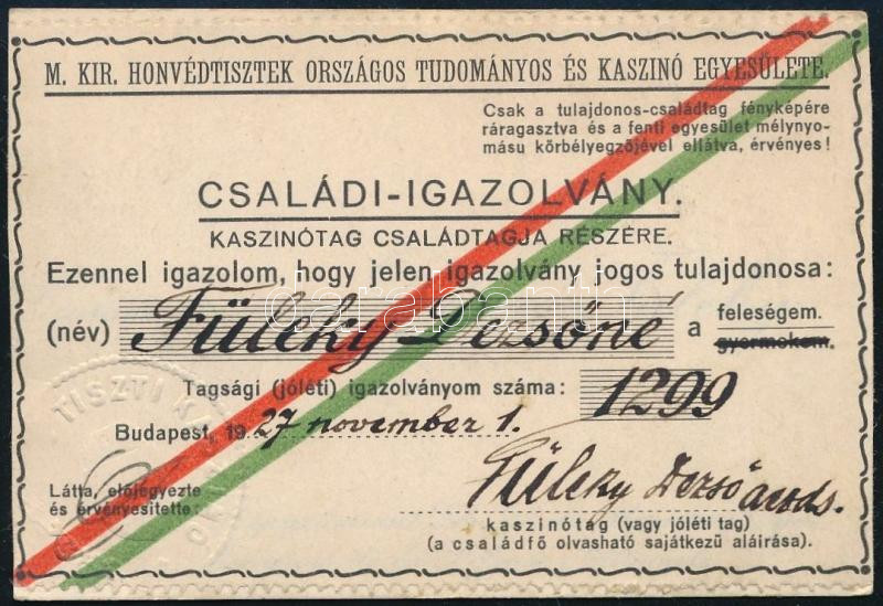 1927 Honvéd Kaszinótag feleségének szóló fényképes igazolvány