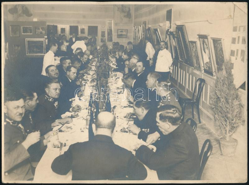 1937 Katonák áldomást isznak sok festmény között. feliratozott fotó 24...