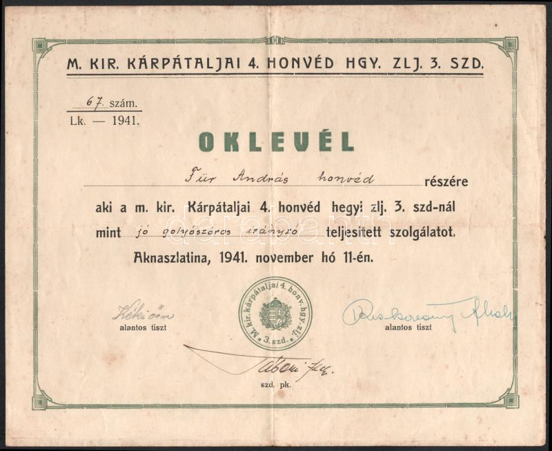 Description: 1941 Aknaszlatina, M. Kir. Kárpátaljai 4. Honvéd Hegyivadász Zászlóalj 3 század honvéd golyószóros irányzó részére szóló oklevél, hajtott, pecséttel és századparancsnoki aláírással.