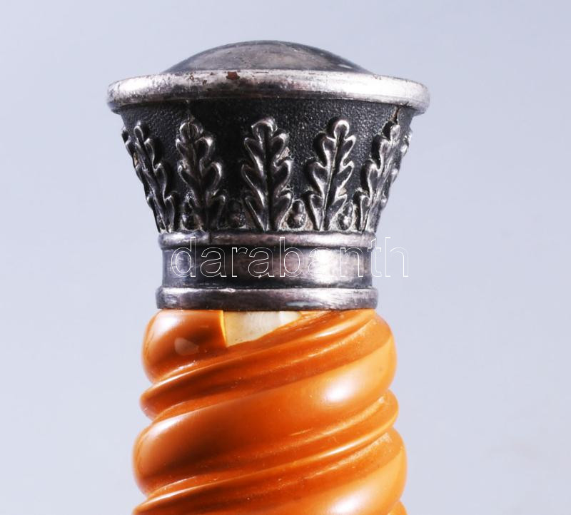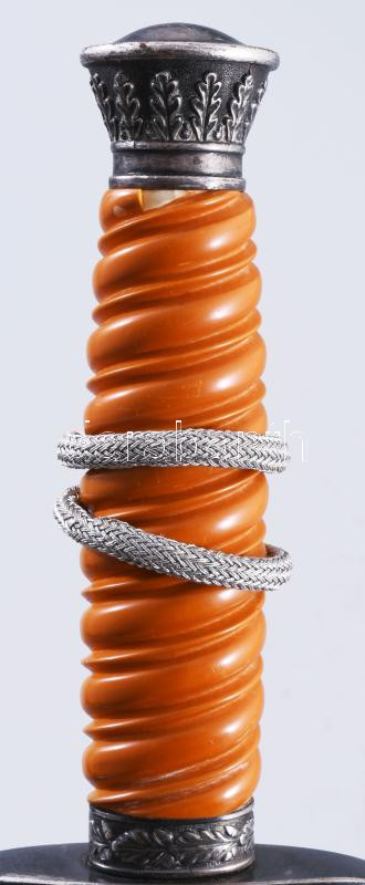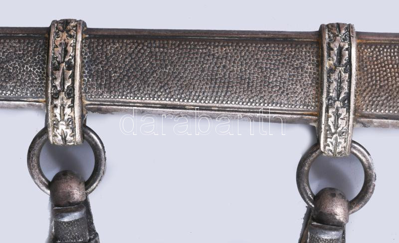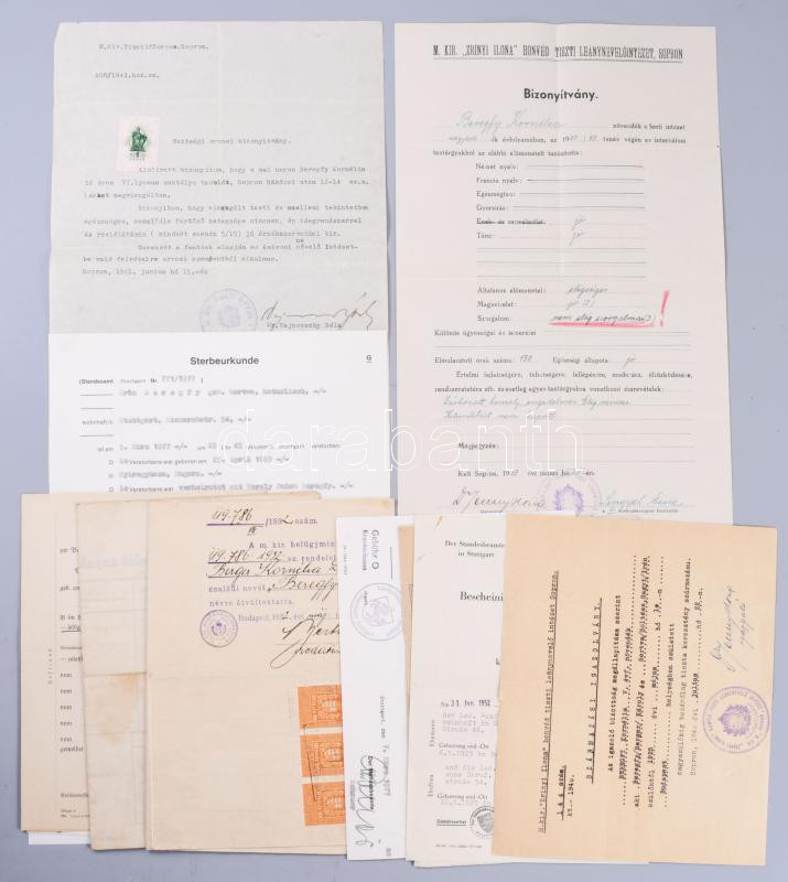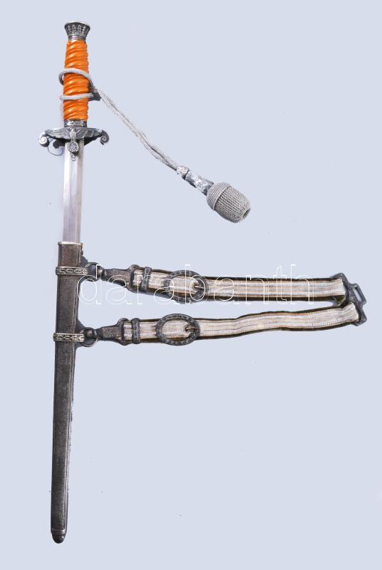 Wehrmacht 1935M tiszti dísztőr WKC Solingen gyártói jelzéssel, kissé sérült bakelit markolattal, csatlékkal, kardbojttal. Beregfy Károly (1888-1946), a Szálasi kormány később kivégzett hadügyminiszterének hagyatékából, hozzá családi dokumentumaik cca 1920-1955 feleségének és lányának okmány hagyatéka. 15 db irat: magyarországi bizonyítványok, származási igazolások, német emigrációban kelt igazolások, halotti értesítők, névváltoztatási engedély / Wehrmacht 1935M Third Reich Army officers' dress dagger with small damage on the grip / Heer (WH) Dolch für Offiziere . with family documents