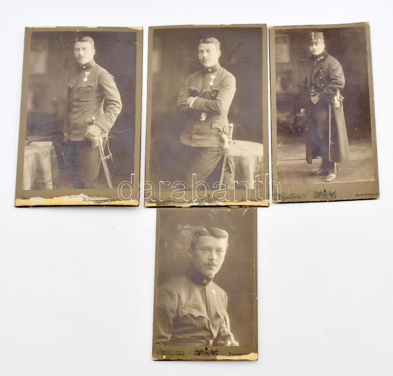 cca 1910 Katonatiszt portréi szablyával, Katonai Érdemérem (Signum Laudis) kitüntetéssel, 4 db keményhátú fotó Mérei és Társa budapesti műterméből, változó állapotban, közte három hiányos hátlappal, 16,5x10,5 cm és 21,5x13 cm között