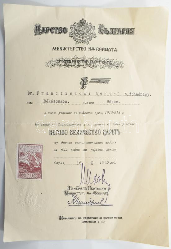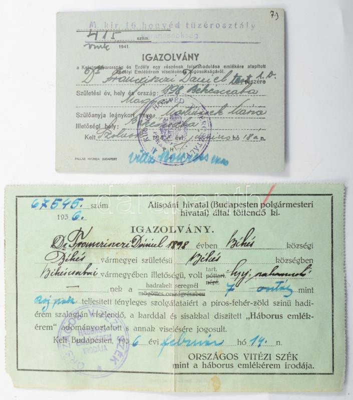 Description: cca 1927-1951 Francziszczi Dániel (1898-1955) békéscsabai orvos iratai: hivatalos levelek, katonai iratok, közte Magyar Háborús Emlékérem és Erdélyi Emlékérem viselési igazolványok; fényképes emléklap és ünnepi egyenruha viselésére jogosító igazolvány; bolgár kitüntetés adományozó oklevél; stb.