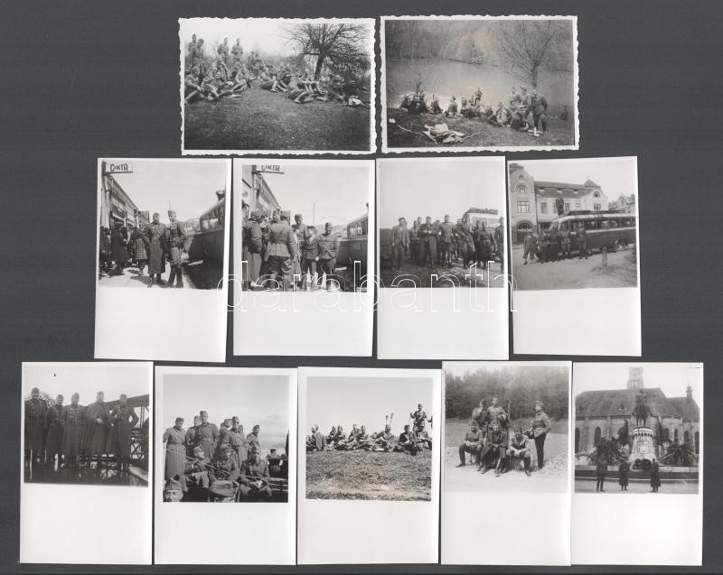 Description: cca 1939 Magyar katonák Erdélyben: a kolozsvári Mátyás király emlékműnél, buszos csoportkép a nagybányai István király szálló előtt, stb., összesen 11 db fotó, 9x6 cm körüli méretben