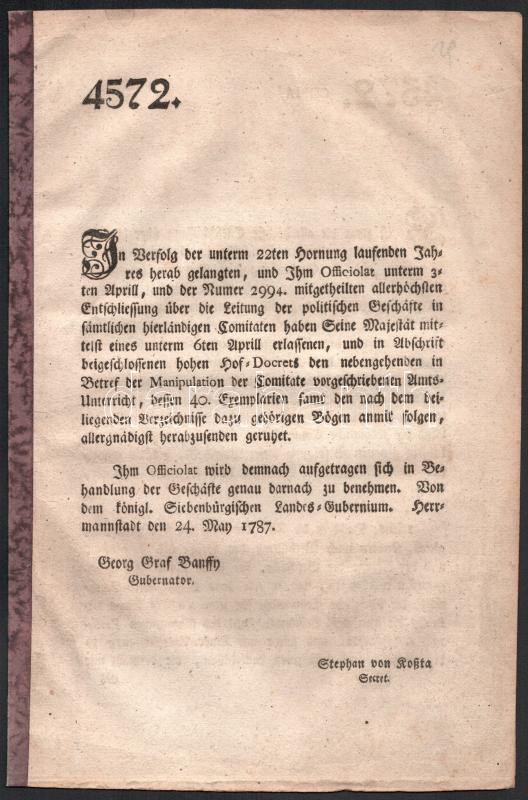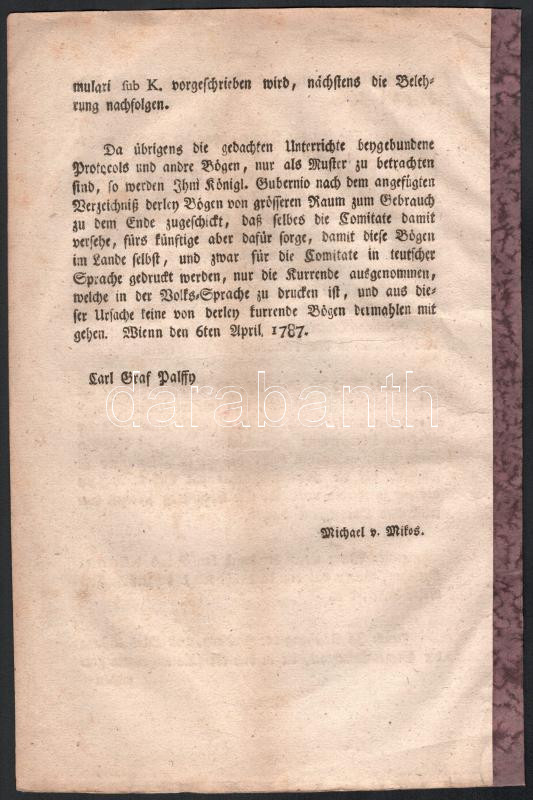 1787 Bánffy György és Pálffy Károly által jegyzett, nyomtatott rendelt német nyelven