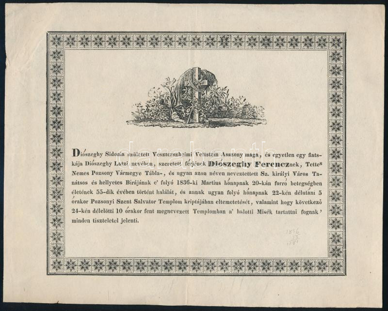 1836 Pozsony, Diószeghy Ferenc, Pozsony vármegye táblabírája halotti értesítője, 19x24 cm