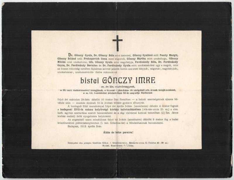 1913 Bp., bistei Gönczy Imre (1862-1913) cs. és kir. vezérőrnagy, a II... https://www.darabanth.com/en/514-Auction-philately-postcards-numismatics-artwork-books-colletibles-jewelry/515.0/Art-and-other-collectibles/Printed-Materials~83/1913-Bp-bistei-Gonczy-Imre-1862-1913-cs-es-kir-vezerornagy-a-III-oszt-Vaskorona-rend-lo~II3478797
