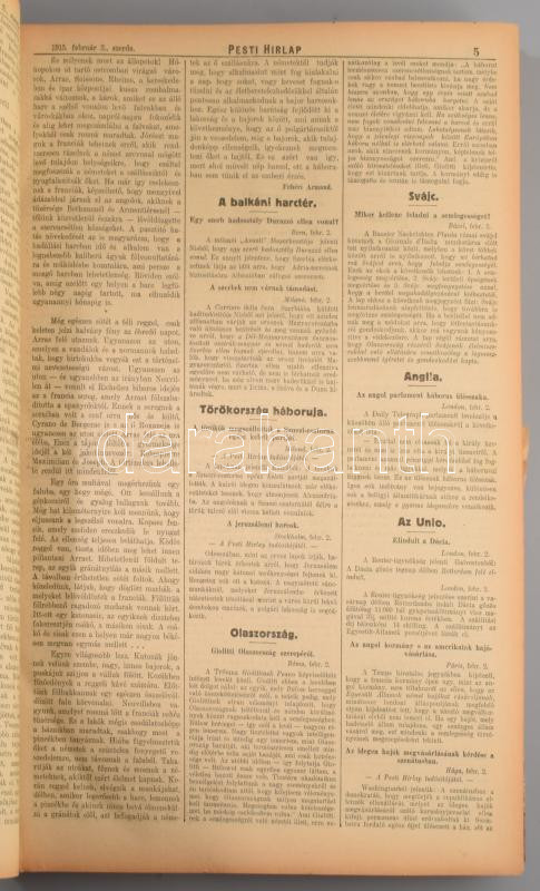 1915 Pesti Hírlap. XXXVII. évf. 32-59. szám. 1915. február 1. - 28. Há... https://www.darabanth.com/en/514-Auction-philately-postcards-numismatics-artwork-books-colletibles-jewelry/515.0/Art-and-other-collectibles/Printed-Materials~83/1915-Pesti-Hirlap-XXXVII-evf-32-59-szam-1915-februar-1-28-Haborus-szamok-Gazdag-ko~II3475351