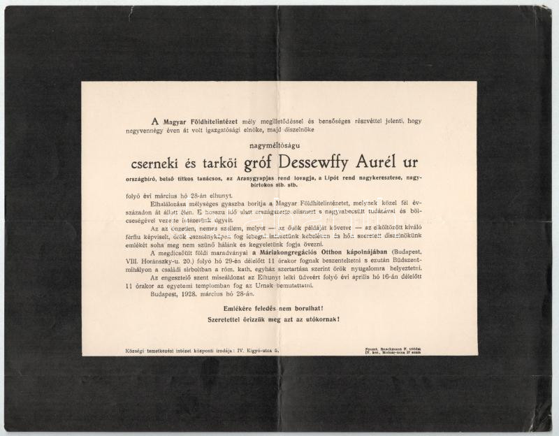 1928 Bp., cserneki és tarkeői gróf Dessewffy Aurél (1846-1928) országbíró, belső titkos tanácsos, országgyűlési képviselő, főrendiházi elnök, az Aranygyapjas rend lovagja halotti értesítője, kisebb lapszéli sérülésekkel, 23,5x30 cm