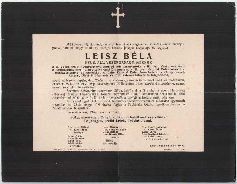 Description: 1942 Székesfehérvár, Leisz Béla (1868-1942) nyug. vezérőrnagy, mérnök, a cs. és kir. 69. Hindenburg gyalogezred volt parancsnoka, a III. oszt. Vaskorona-rend és további kitüntetések tulajdonosa halotti értesítője, kis lapszéli sérülésekkel, 23,5x30 cm