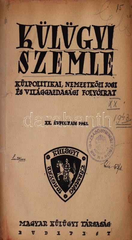 1943 Külügyi Szemle. Külpolitikai, nemzetközi jogi és világgazdasági folyóirat. XX. évf. 1-6. sz., 1943. január - november. (Teljes évfolyam egybekötve). Bp., Magyar Külügyi Társaság, 579+(3) p. (A borítók a lapok után, a kötet végére kötve). Félvászon-kötésben, sérült, leváló gerinccel, kissé vetemedett kötéstáblákkal.