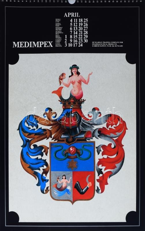1983 Medimpex falinaptár, nemesi címerek ábrázolásaival illusztrálva, angol, német és francia nyelvű szöveggel, egy kijáró lappal, 47x32 cm