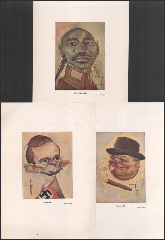 Gatto Nero (Wittman Rezső, 1889-1972): Churchill, Goebbels és Csang Kai Sek (Csang Kaj-sek) karikatúrái, 3 db színes nyomat, lapméret: 25x17,5 cm