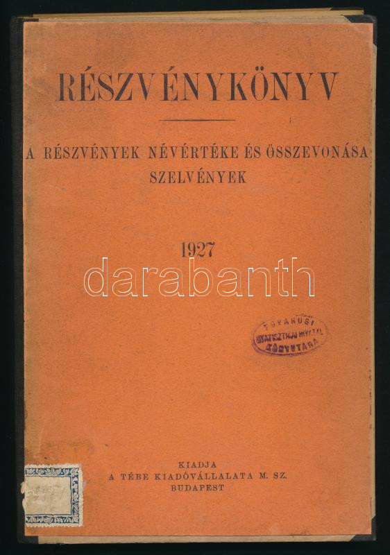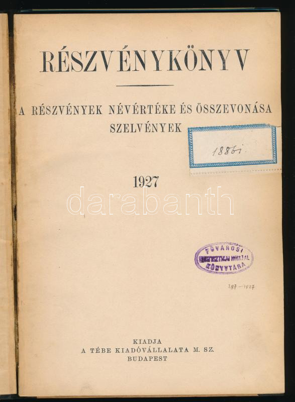 https://www.darabanth.com/en/514-Auction-philately-postcards-numismatics-artwork-books-colletibles-jewelry/515.0/Art-and-other-collectibles/Printed-Materials~83/Reszvenykonyv-A-reszvenyek-nevertlke-es-osszevonasa-szelvenyek-Bp-1927-TEBE-44p-~II3410590