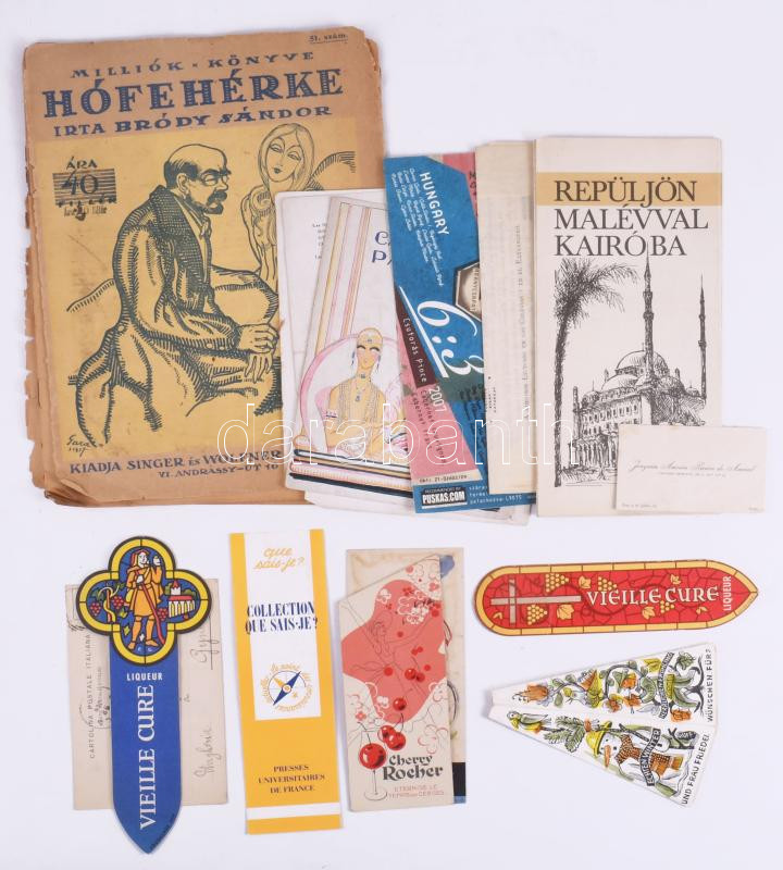 Vegyes papírrégiség tétel: könyvjelzők, Malév reklám, stb