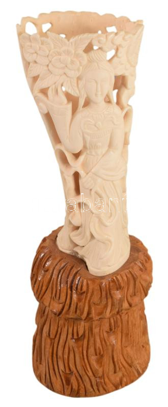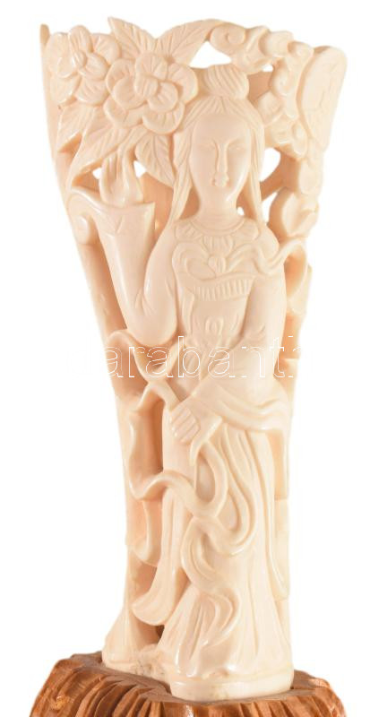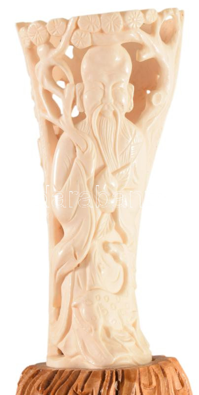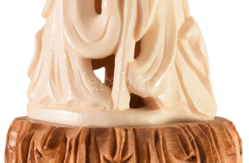Faragott csont keleti szobor, Keleti Bölcs ábárzolással fa talapzaton 23 cm