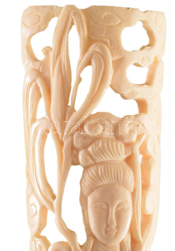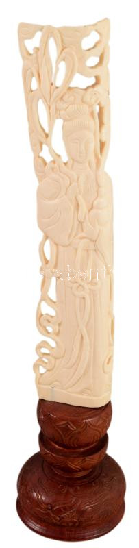 Faragott csont keleti szobor, gésa ábrázolással, fa talapzaton, m: 28 ...