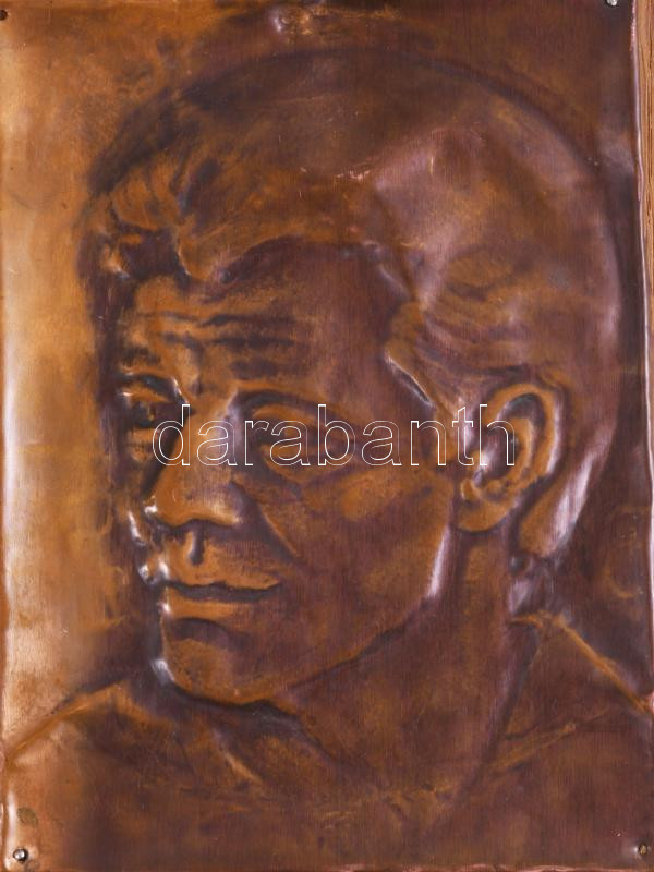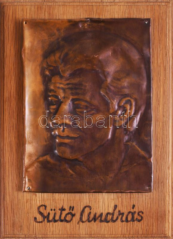 Sütő András domborított rézlemez kép, fa lapon, 14x11 cm