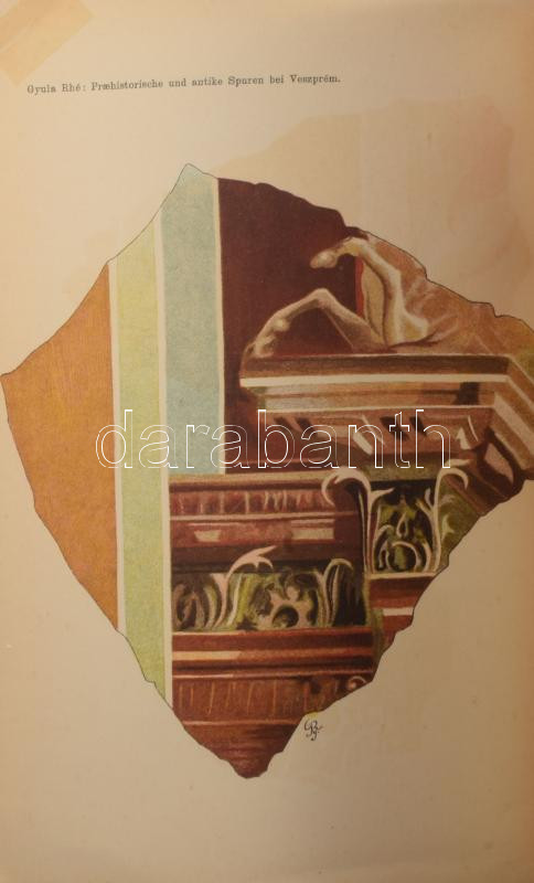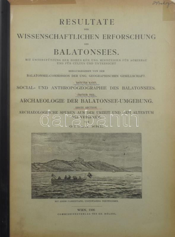 Rhé, Gyula: Archaeologische Spuren aus der Urzeit und dem Altertum bei Veszprém. [Ős- és ókori nyomok Veszprém körül.] Resultate der wissenschaftlichen Erforschung des Balatonsees [A Balaton tudományos tanulmányozásának eredményei] III. Band, Erster Teil, Erste Section. Wien, 1906, Balatonsee-Commission der Ung. Geographischen Gesellschaft [Magyar Földrajzi Társaság Balaton-Bizottsága] - Ed. Hölzel, (Hornyánszky-ny.), 2+33 p.+2 (chromolitográfia) t. Német nyelven. Kiadói papírkötés, modern védőborítóban, a borító javított, a hátsó borító és az utolsó tábla felső sarkain restaurációval, az első táblán javításnyommal.