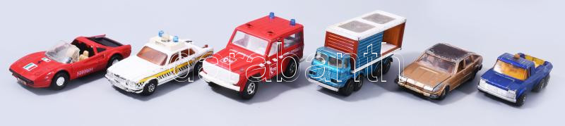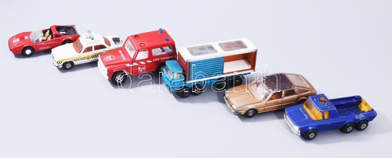 6 darab fém játékautó, sérüléssel, h: 13 cm alatt