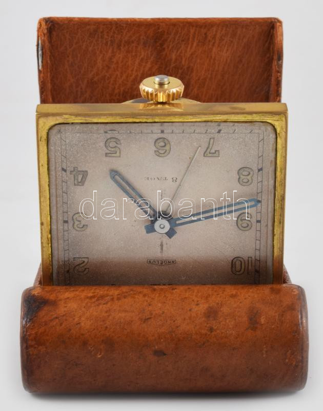 Angelus 8 napos járatú mechanikus utazóóra. Frissen szervizelt, bőr tokkal. 7x10 cm