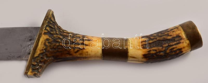 Dísztőr, agancs és réz markolattal, vörös plüssborítású fém hüvellyel, h: 32 cm