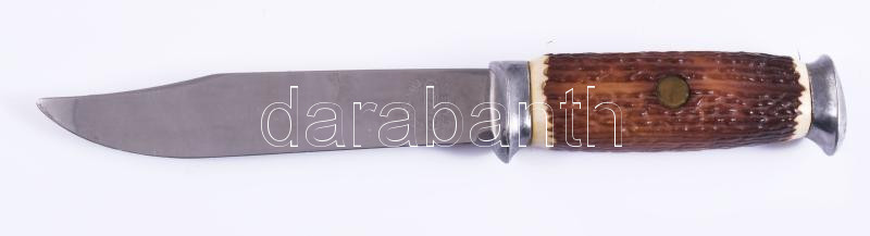 Mikov tőr agancs markolattal, bőr tokban, h: 24,5 cm
