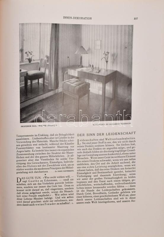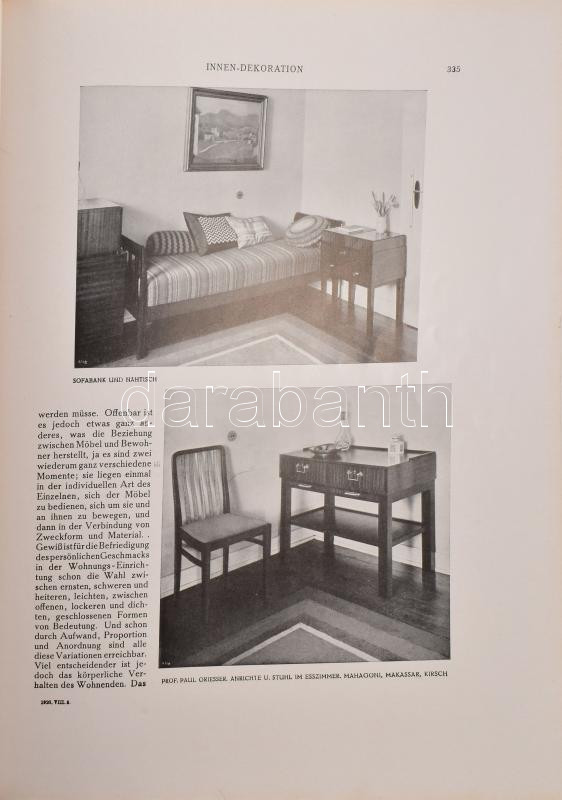 1928 Innendekoration. Die gesamte Wohnungskunst in Bild und Wort. Herausgeber: Hofrat Alexander Koch. XXXIX. Jahrgang. Mai, Juni, Juli, August, September. (5 db.) Darmstadt, Alexander Koch. Fekete-fehér képekkel illusztrálva, hirdetésekkel. Német nyelven. Kiadói papírkötés, szakadt borítókkal, de belül jó állapotban.