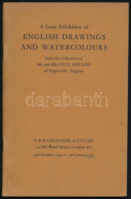 Description: A Loan Exhibition of English Drawings and Watercolours from the collection of Mr and Mrs Paul Mellon of Upperville, Virgina. (Kiállítási katalógus.) London, 1965, P. & D. Colnaghi & Co. Ltd. Fekete-fehér reprodukciókkal illusztrálva. Angol nyelven. Kiadói tűzött papírkötés.