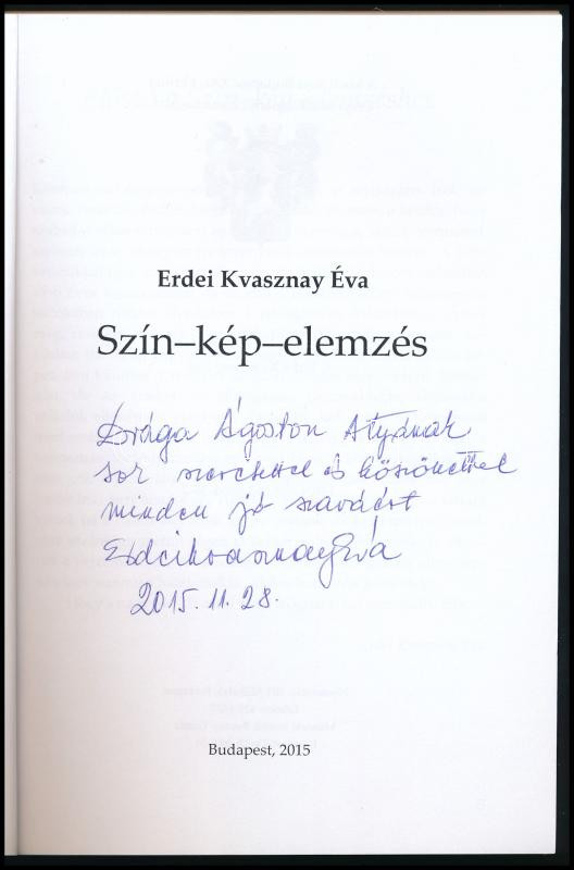 Description: Erdei Kvasznay Éva: Szín-kép-elemzés. A szerző, Erdei Kvasznay Éva (1942- ) Munkácsy-díjas festő, képzőművész által dedikált példány. Bp., 2015, magánkiadás, 268 p. Egyetlen kiadás. Kiadói papírkötés.