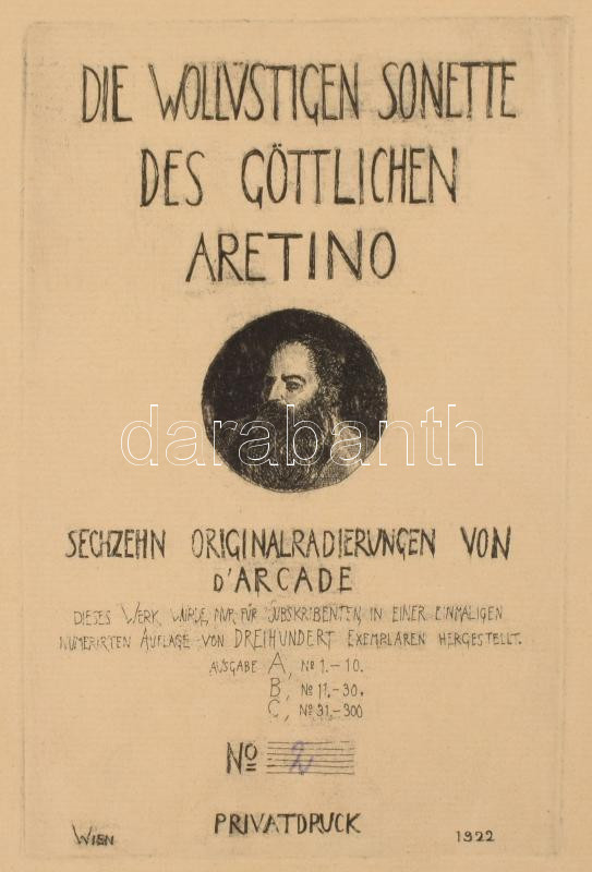 [Erotikus grafika kiadvány] Die wollustigen Sonette des göttlichen Aretino 16 original radierungen von D'arcade. Wien, 1922. Szerzői. 17t rézkarcok. Számozott 2. sorszámú TÁblák 22x28 cm Kiadói egészvászon kötésben