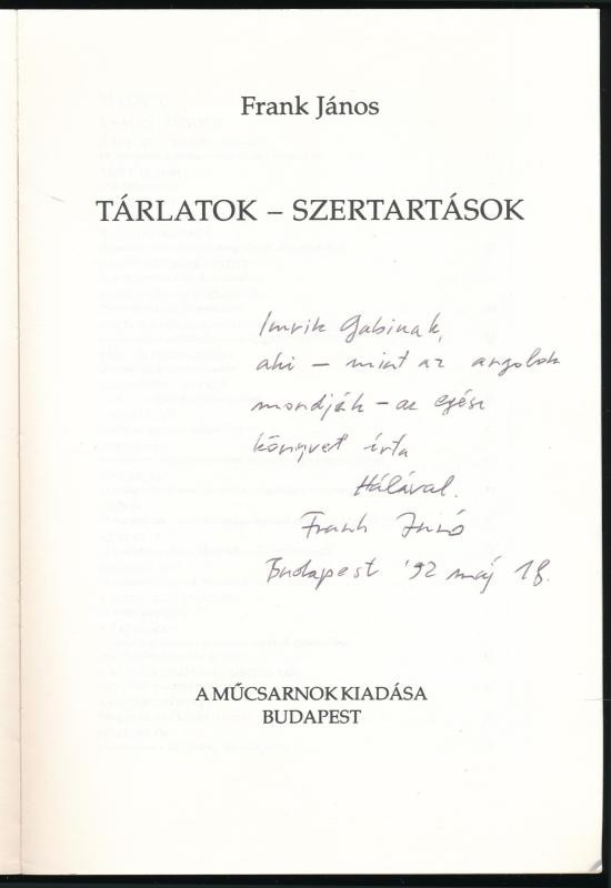 Frank János: Tárlatok - szertartások. A szerző, Frank János (1925-2004... https://www.darabanth.com/en/514-Auction-philately-postcards-numismatics-artwork-books-colletibles-jewelry/515.0/Books/Books-Architecture-Art~619/Frank-Janos-Tarlatok-szertartasok-A-szerzo-Frank-Janos-1925-2004-Szechenyi-dijas-muvC3~II3435508