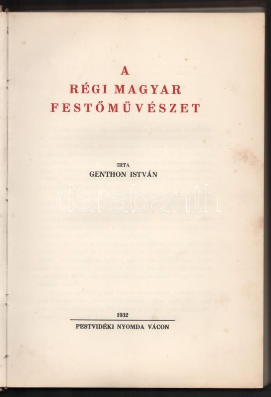 Genthon István: A régi magyar festőművészet. Vác,1932, Pestvidéki Nyomda, 127+5 p.+48 t. (kétoldalas),102 képpel. Kiadói bibliofil, aranyozott félpergamen-kötésben, kopott, kissé foltos borítóval, laza, kissé sérült fűzéssel.