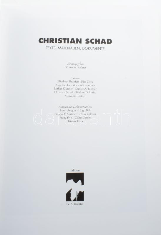 Günter A. Richter (szerk.): Christian Schad. Texte, Materialien, Dokum... https://www.darabanth.com/en/514-Auction-philately-postcards-numismatics-artwork-books-colletibles-jewelry/515.0/Books/Books-Architecture-Art~619/Gunter-A-Richter-szerk-Christian-Schad-Texte-Materialien-Dokumente-Rottach-Egern-2004-G~II3477358