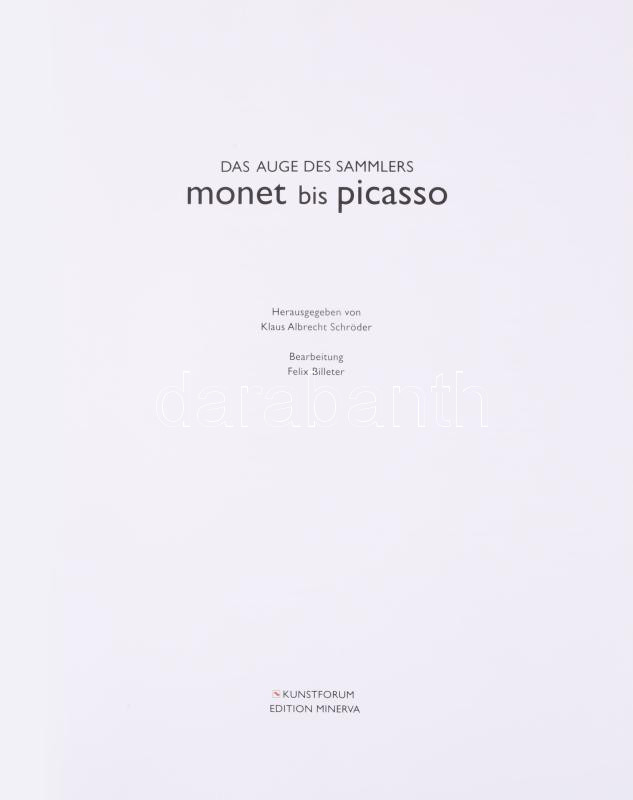 Description: Monet bis Picasso. Das Auge des Sammlers. (Kiállítási katalógus.) Szerk.: Klaus Albrecht Schröder. Wien-Eurasburg, 1998, Kunstforum - Edition Minerva. Gazdag képanyaggal illusztrálva. Német nyelven. Kiadói papírkötés.