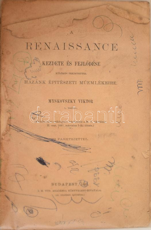 Myskovszky Viktor: A renaissance kezdete és fejlődése. Különös tekintettel hazánk építészeti műemlékeire. 18 fametszettel. Bp., 1881, MTA, 54 p. Kiadói papírkötés, sérült, firkált címlappal, sérült, foltos borítóval, az elülső borító hiányzik.