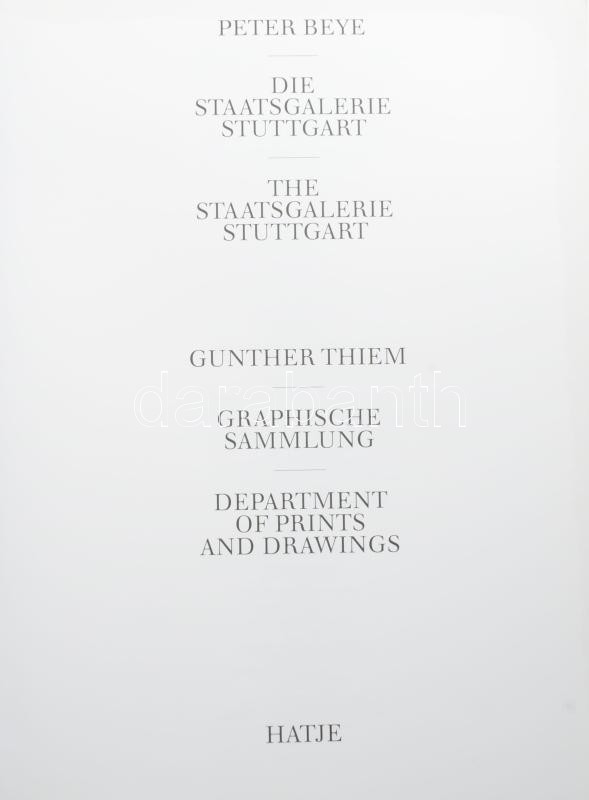 Description: Peter Beye: Die Staatsgalerie Stuttgart. / The Staatsgalerie Stuttgart. - Gunther Thiem: Graphische Sammlung. / Department of Prints and Drawings. Ostfildern, 1991, Gerd Hatje. Gazdag képanyaggal illusztrálva. Német és angol nyelven. Kiadói papírkötés.